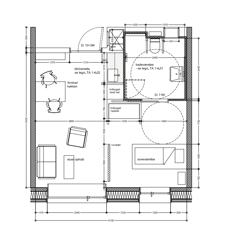 Soveværelset er adskilt fra opholdsrummet med en rumdeler, som kan afmonteres og reetableres for borgerens regning. Der er et stort klædeskab og en seng med madras.
